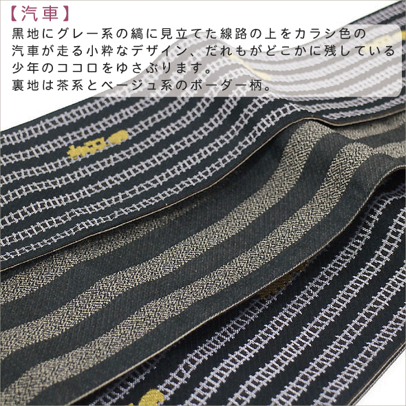 【汽車】 黒地にグレー系の縞に見立てた線路の上をカラシ色の汽車が走るデザイン。