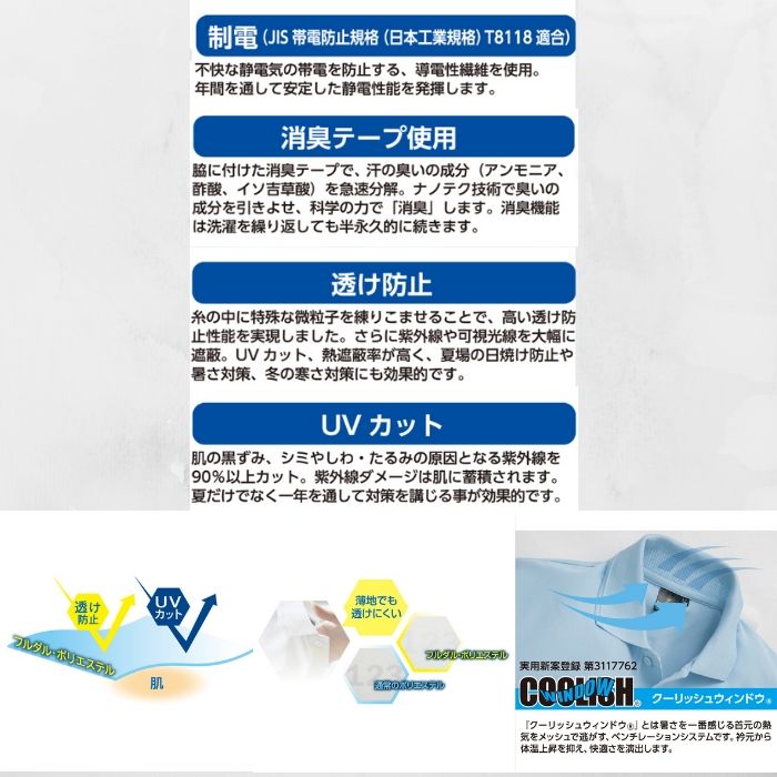 ・メーカー:コーコス CO-COS ・品 番:A-3377 ・素 材:制電フルダル鹿の子 ・混 率:ポリエステル100% ・サイズ:SS、S、M、L、LL、3L、4L、5L ※お使いのPCモニターにより、実際のお色と異なって見える場合がございます。
