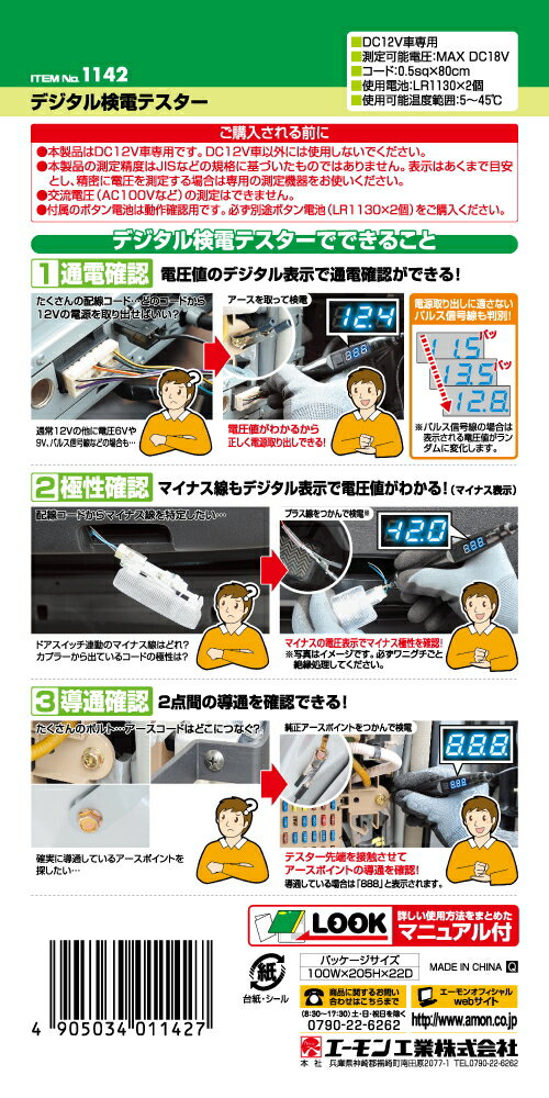 エーモン 【1142】デジタル検電テスター 商品説明 通電・極性・導通の確認ができる多機能検電テスター ■電圧値のデジタル表示で通電確認ができる ■マイナス線もデジタル表示で電圧値がわかる ■2点間の導通を確認できる ■オートOFF機能付で切り忘れを防止 ■詳しい使用方法をまとめたマニュアル付 ■ボタン電池付属(動作確認用) ※付属のボタン電池は、動作確認用です 別途ボタン電池(LR1130×2個)をお買い求めください ※交流電圧(AC100Vなど)の測定はできません 【仕様】 ・DC12V車専用 ・測定可能電圧:MAXDC18V ・推奨測定電圧範囲:DC9V〜15V ・使用可能温度範囲:5〜45℃ ・コードサイズ:0.5sq×約80 【内容物】 ・デジタル検電テスター:1本 ・動作確認用ボタン電池(LR1130):2本 ※掲載商品の仕様、デザイン、生産国、発売時期は 予告なく変更する場合がありますので、 あらかじめご了承ください。